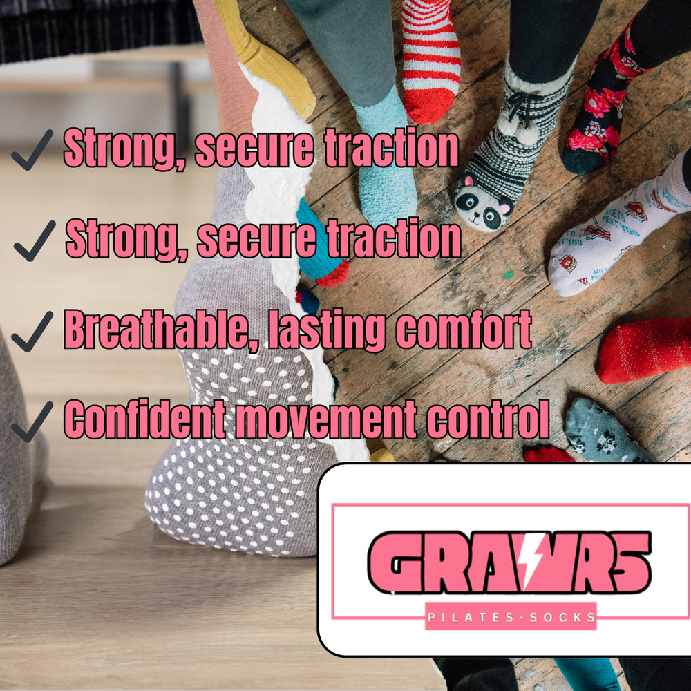 GRAVRS socks are engineered for secure traction, breathable comfort, and confident footing during Pilates, Yoga, Barre, and everyday movement.